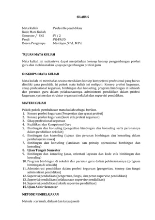 Dokumen ini adalah silabus mata kuliah Profesi Kependidikan dengan kode mata kuliah dan informasi semester, yang bertujuan agar mahasiswa memahami konsep pengembangan profesi guru. Mata kuliah mencakup topik seperti sikap profesional keguruan, bimbingan dan konseling, administrasi pendidikan, dan supervisi pendidikan. Metode pembelajaran meliputi ceramah dan diskusi, dengan penilaian berdasarkan kehadiran, presentasi, UTS, dan UAS.