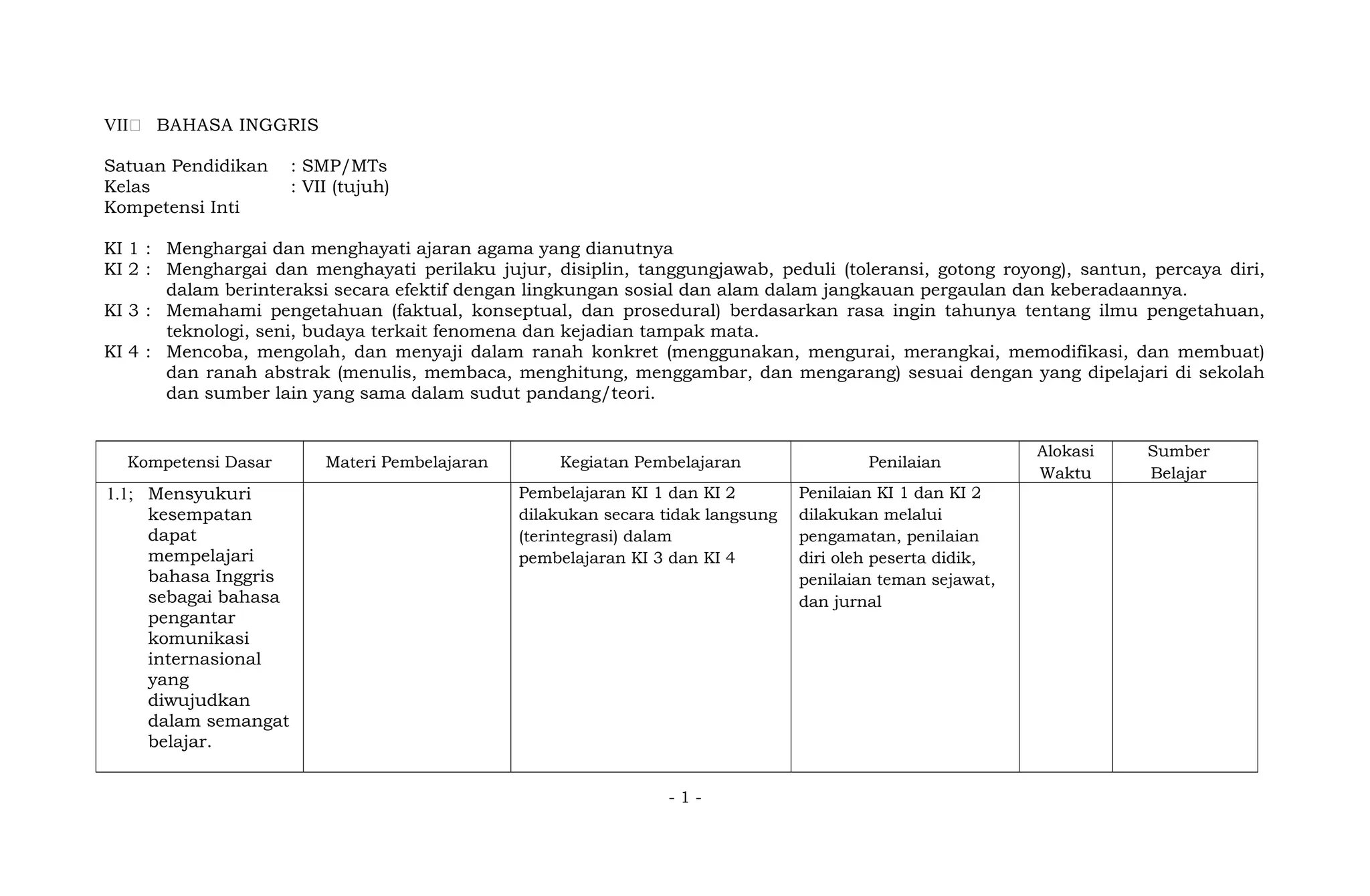 Dokumen ini merupakan panduan kurikulum untuk pembelajaran bahasa Inggris di SMP/MTS kelas VII, yang berfokus pada pengembangan kompetensi sosial dan kebahasaan siswa melalui komunikasi interpersonal dan transaksional. Pembelajaran dilakukan melalui berbagai kegiatan, termasuk observasi, simulasi, dan penilaian diri untuk memperkenalkan diri, mengucapkan sapaan, pamitan, dan ucapan terima kasih dalam bahasa Inggris. Ringkasan juga mencakup pentingnya keteladanan perilaku baik dari guru dan siswa dalam proses belajar mengajar.