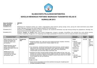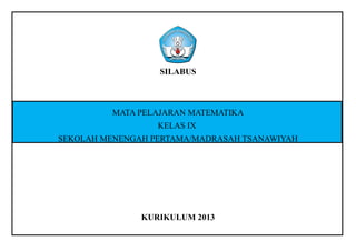 Dokumen ini adalah silabus mata pelajaran matematika untuk kelas IX di sekolah menengah pertama/madrasah tsanawiyah dengan kurikulum 2013, yang mencakup kompetensi inti dan dasar, materi pokok, serta pendekatan pembelajaran yang digunakan. Fokus utama adalah pada pemahaman konsep bilangan, fungsi kuadrat, perbandingan, dan sistem koordinat, melalui pengamatan, diskusi, dan penyelesaian masalah. Penilaian dilakukan melalui berbagai instrumen termasuk tugas, portofolio, dan tes.