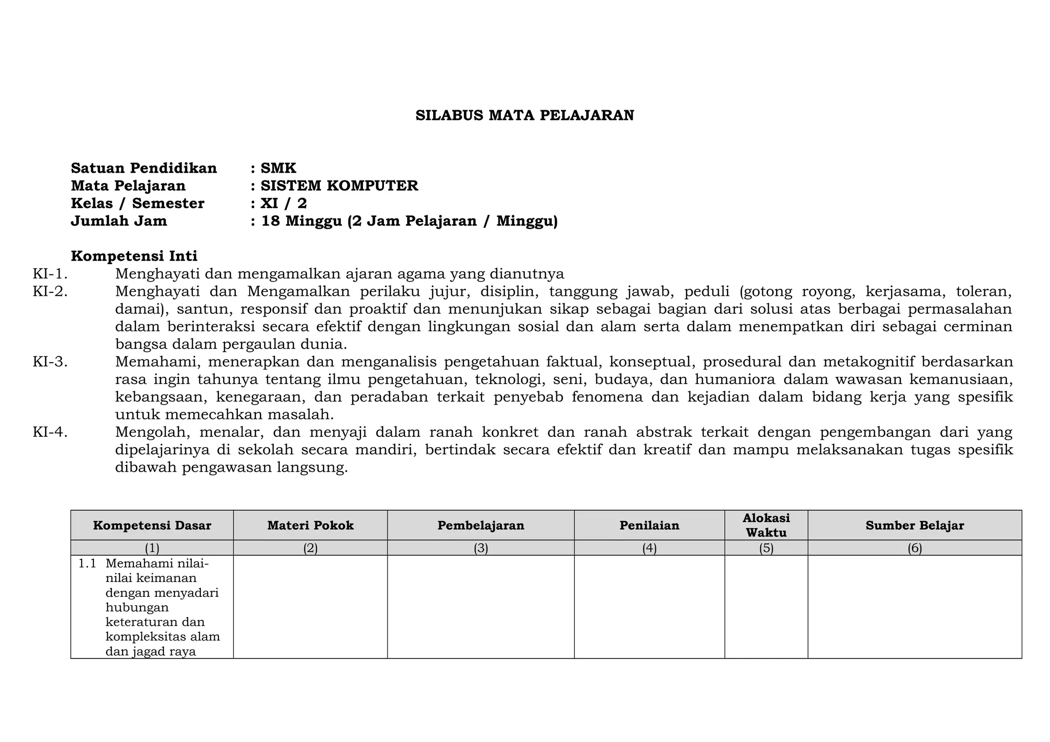 Silabus mata pelajaran sistem komputer untuk kelas XI semester 2 mencakup 18 minggu pelajaran dengan alokasi waktu 2 jam per minggu. Materi pokoknya meliputi organisasi processor seperti struktur CPU, ALU, control unit, dan register internal. Karakteristik set instruksi seperti elemen-elemen instruksi, tipe-tipe instruksi dan operasi, serta tipe-tipe operand. Mode dan format pengalamatan seperti inhernt, immediate, direction, extended, indexed. Pembelajaran dil