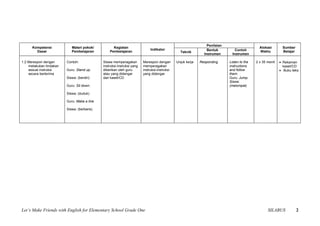Dokumen ini adalah silabus untuk pelajaran Bahasa Inggris kelas I pada semester 1 dan 2. Silabus mencakup standar kompetensi dalam mendengarkan, berbicara, membaca, dan menulis, dengan metode penilaian serta kegiatan yang difokuskan pada pemahaman dan penggunaan kosakata sederhana dalam konteks kelas. Metode pembelajaran yang diusulkan melibatkan interaksi lisan dan praktik langsung dengan berbagai alat peraga.