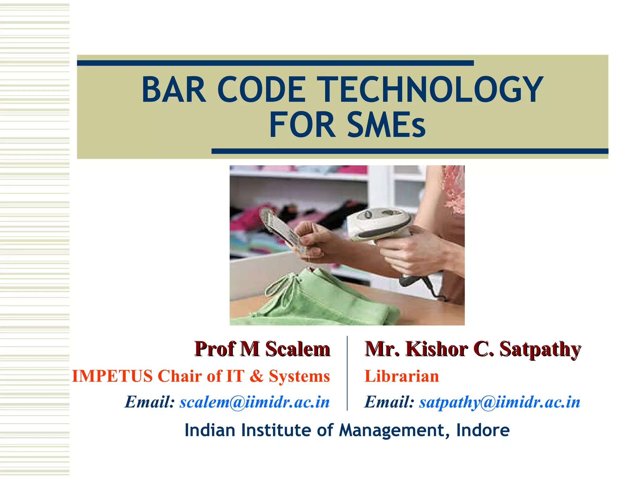 The document provides an overview of bar code technology and its uses and benefits. It discusses how bar codes work by encoding data in varying widths of black and white bars that can be scanned electronically. Bar codes allow for fast, accurate, and efficient data entry. The document outlines common applications of bar codes in retail, warehouses, healthcare, transportation and more. It also discusses the components needed for a bar code system and provides an example of how bar codes have improved operations at a library by streamlining check-in/check-out processes.