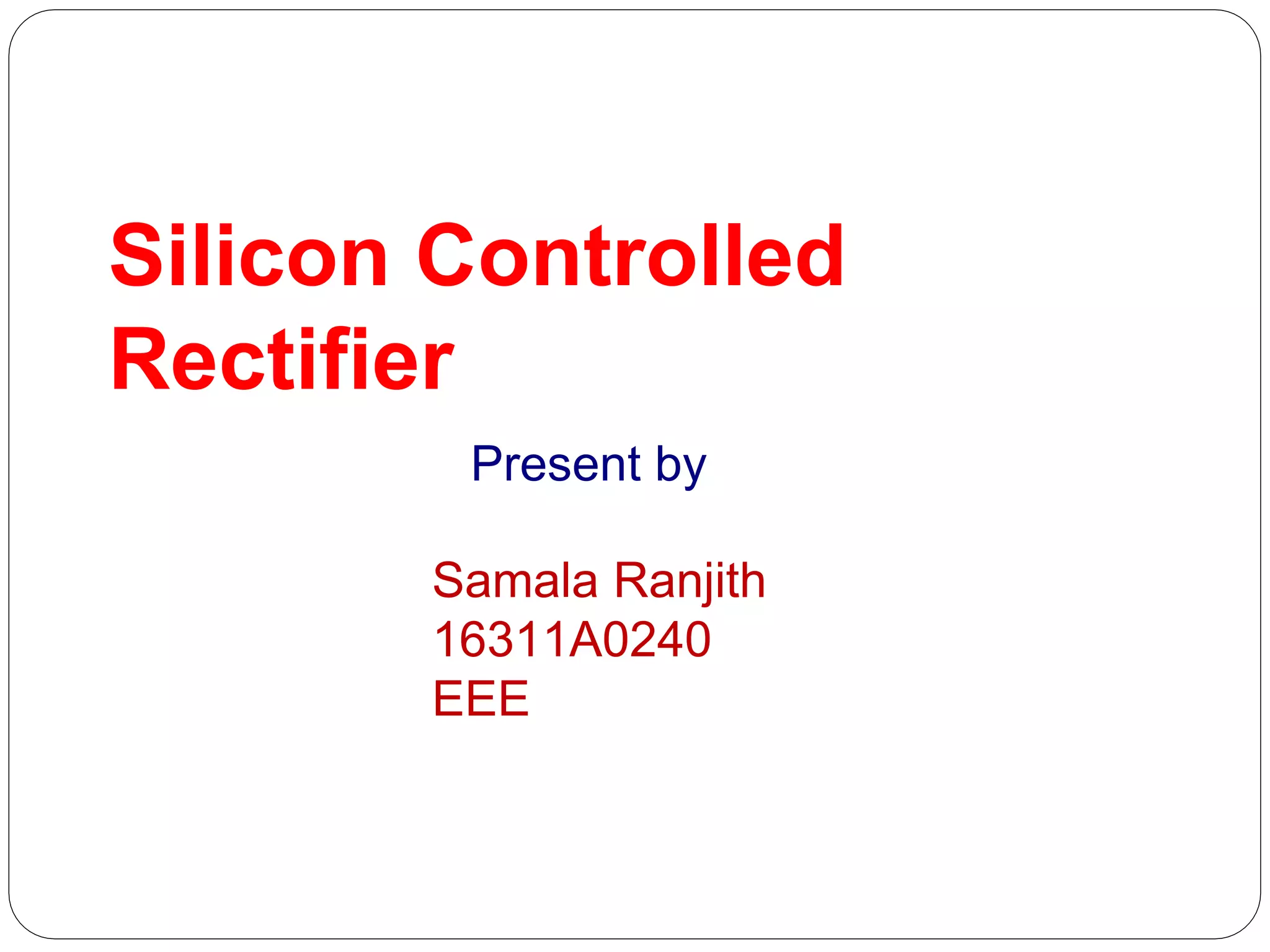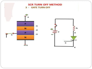 This document provides an overview of the silicon controlled rectifier (SCR). It discusses the SCR's four-layer semiconductor structure with three p-n junctions. The document outlines the SCR's history, construction, v-i characteristics, switching on and off methods, applications, advantages, and disadvantages. Key points covered include the SCR's ability to handle large voltage, current and power; its simple triggering circuit and control; and its limitations for higher frequency use and negative gate current.