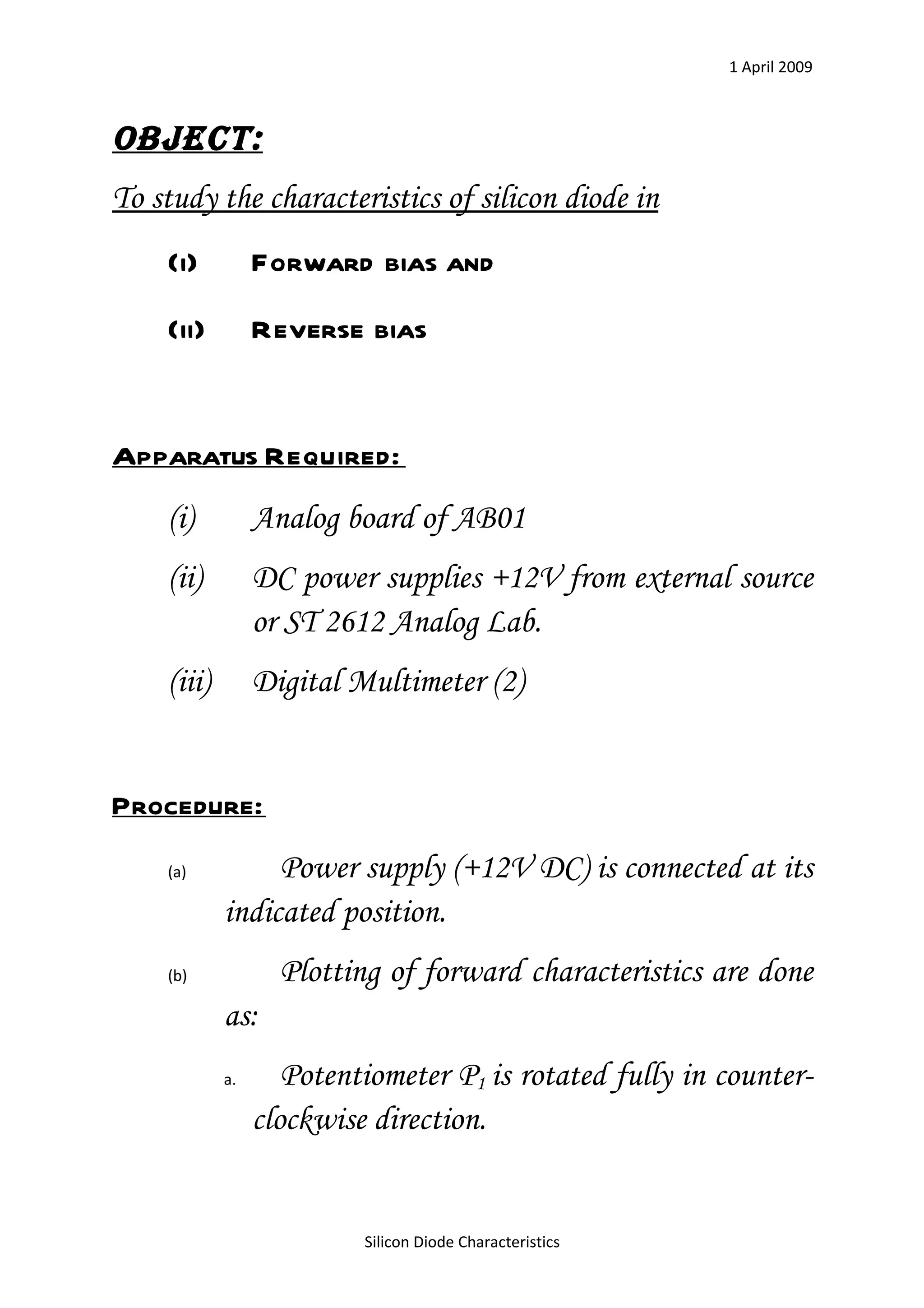 This document outlines a procedure to study the characteristics of a silicon diode under forward and reverse bias. The apparatus required includes an analog board, DC power supplies, digital multimeters, and potentiometers. Under forward bias, the potentiometer is used to vary the diode voltage from 0 to 1V while measuring the corresponding current values. A graph of the voltage-current relationship is plotted. Under reverse bias, the potentiometer varies the voltage from 0 to 10V and the current is observed and recorded.