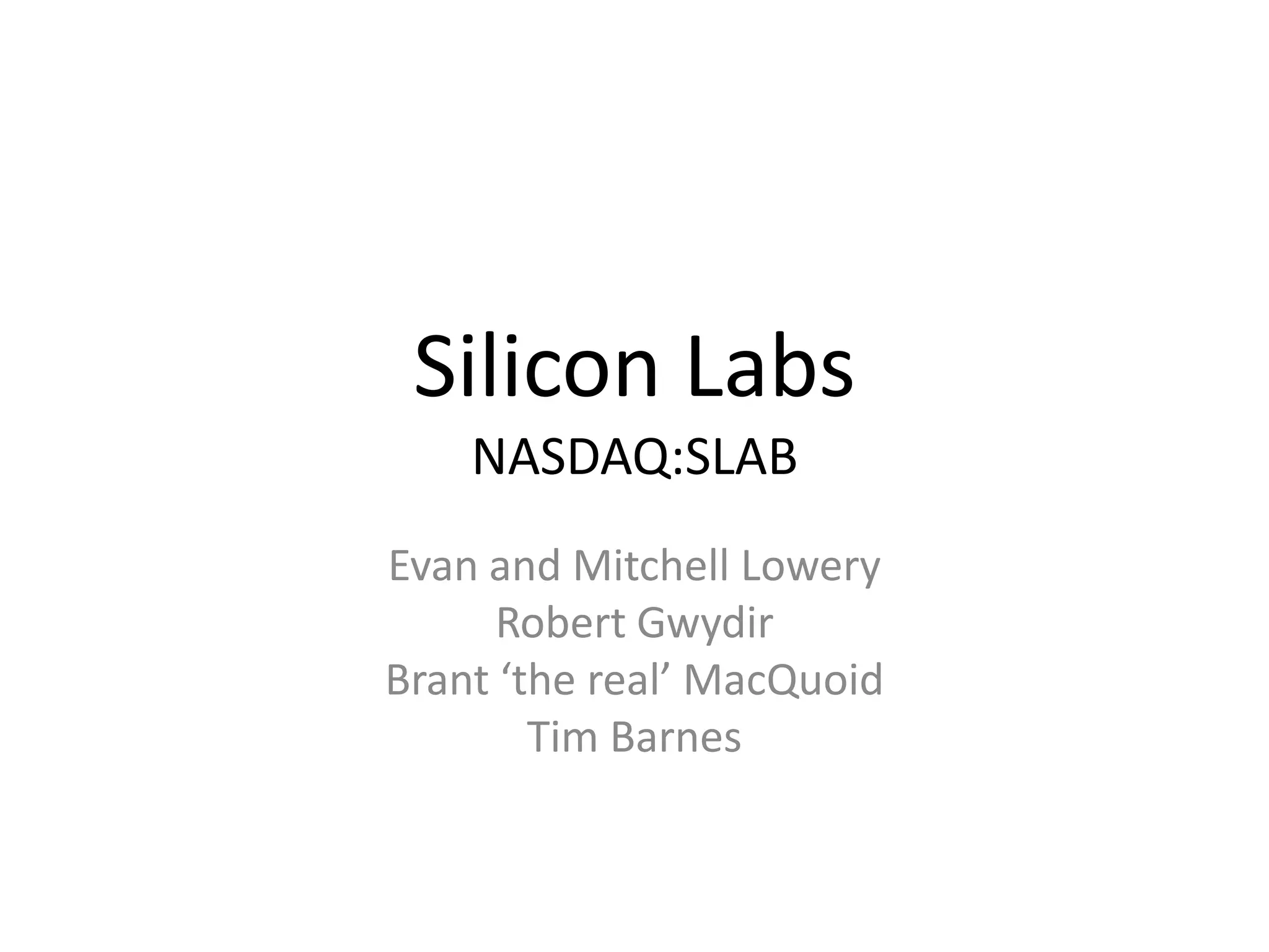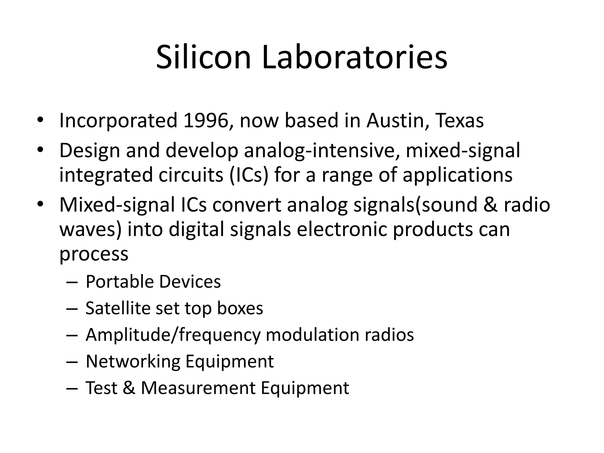 Silicon Labs is a semiconductor company incorporated in 1996 based in Austin, Texas. They design and develop analog and mixed-signal integrated circuits for applications including portable devices, networking equipment, and test and measurement equipment. Their product portfolio includes microcontrollers, timing products, wireless receivers, and isolation devices. While they have a number of competitors, Silicon Labs differentiates itself through its expertise in analog-intensive mixed-signal circuit design. The company has a diversified customer base including Apple, Cisco, and Samsung.