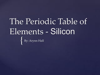 Silicon has an atomic number of 14, atomic mass of 28.085, and symbol Si. It has a melting point of 1410°C and boiling point of 3265°C. Silicon is commonly found in computers, cars, cosmetics, and foods. It is the second most abundant element on Earth, making up over 80% of the crust, and is found in many common minerals like granite and clay.