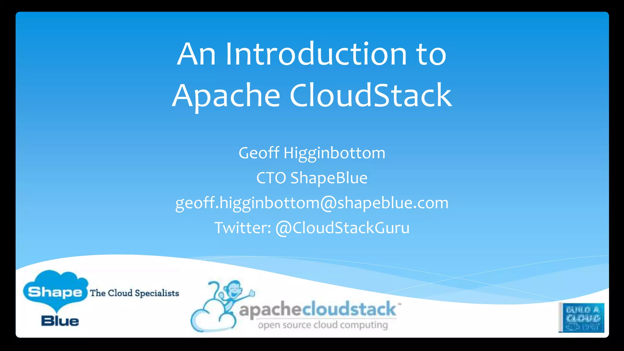 This document introduces Apache CloudStack, an open source cloud computing platform. It discusses that CloudStack provides infrastructure as a service capabilities, including tools for deploying and managing private and public clouds. It also summarizes some key features of CloudStack such as its support for various hypervisors, scalable architecture, and AWS API compatibility.