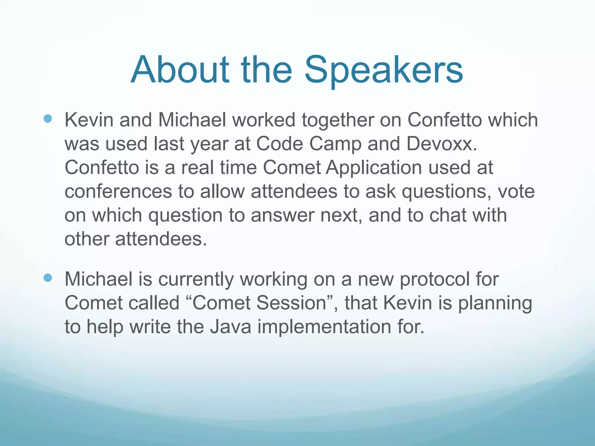 The document summarizes a presentation by Kevin Nilson and Michael Carter about comet technologies. Kevin and Michael previously worked on Confetto, a comet application used at conferences. Michael is currently working on a new comet protocol called Comet Session that Kevin plans to help implement in Java. The presentation agenda includes an overview of comet, obstacles in implementing comet, introductions to CometD and Atmosphere (Java), and Orbited. Michael will discuss the Comet Session protocol. Kevin will cover practical CometD application development.