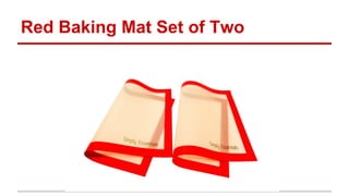 This document discusses silicone baking mats, listing three product options - a red baking mat set of two, a black silicone mat set of two, and a silicone black mat set. The document provides a brief product listing of silicone baking mat options.
