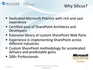 Silicus provides SharePoint services and solutions including portal implementation, migration, custom application development, business intelligence/reporting, enterprise content management, and social/collaboration solutions. They have experience across industries and a methodology for accelerated delivery. Their services are delivered by over 200 professionals including SharePoint architects and developers.