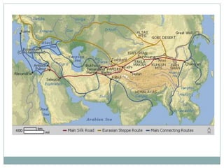 The Silk Road was an extensive network of trade routes that connected Asia, the Middle East, and Europe. Missionaries, traders, and travelers used these routes to exchange goods like silk, spices, perfumes, medicines, and agricultural products, while also spreading religions, technology, and plague. Trade on the Silk Road had significant cultural and economic impacts as it facilitated exchanges that influenced art, culture, and the development of technologies between the various regions.
