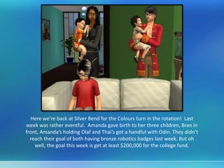 This document provides a summary of Week Four at Silver Bend for the Colours turn in the rotation. Key events include: Amanda giving birth to her fourth son Oddmund; Thai and Amanda working hard to raise money for their children's college funds through their businesses Colouriffic and Dreamweaver; and Bran getting in trouble for sneaking out on a date despite being grounded. The week ends with the family hosting a get-together at their new home.