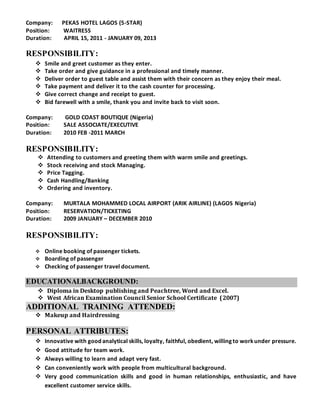 SILVER JUDE MICHEAL is a Nigerian national seeking a placement where she can utilize her skills and experience. She has over 5 years of experience in customer service roles including as a receptionist and waitress at Pekas Hotel in Lagos, and has also worked as a sales associate, reservation agent, and in makeup and hairdressing. She has a diploma in desktop publishing and business software skills. Her personal attributes include being innovative, a team player, willing to learn, and having strong communication and customer service abilities.
