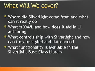 - How to develop Silverlight applications using Visual Studio and Expression Blend.