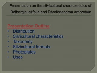 This document provides information on two tree species: Dalbergia latifolia (Indian rosewood) and Rhododendron arboretum. It discusses the distribution, silvicultural characteristics, taxonomy, silvicultural formula, and uses of each species. For D. latifolia, it describes its distribution in the Terai and lower Himalayas, tolerance for light, frost, drought, fire, ability to coppice and root sucker, palatability to browsing animals, preference for well-drained soil, and associates in Dalbergia sissoo forest. For R. arboretum, it covers its distribution above 1500m, tolerance for light, frost, drought and fire,