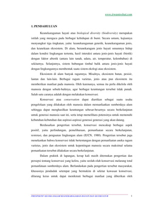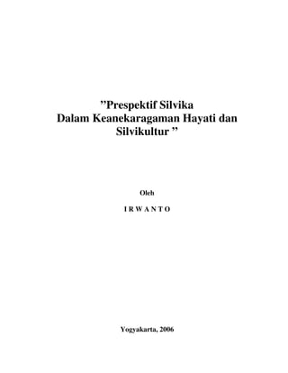 Dokumen ini membahas pentingnya keanekaragaman hayati dan konservasi dalam silvikultur, menekankan hubungan antara ekosistem dan pemanfaatan sumber daya alam secara berkelanjutan. Konservasi harus dilakukan untuk melindungi dan memelihara spesies serta ekosistem, sambil tetap memungkinkan pemanfaatan yang bertanggung jawab. Ditekankan pula bahwa hutan hujan tropis memiliki peran penting dalam keanekaragaman hayati global dan perlunya pengelolaan yang bijaksana agar tidak terjadi kerusakan lebih lanjut.