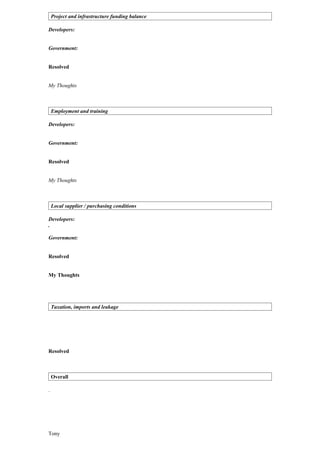 This document contains an agenda for a meeting to discuss a proposed all-inclusive leisure resort, including discussions around site availability and ownership, land assembly, development density and design, access to the site, project infrastructure, employment and training opportunities, local supplier conditions, taxation, and an overall discussion. The agenda outlines discussing the developer and government positions on these issues as well as any potential sticking points and resolutions.