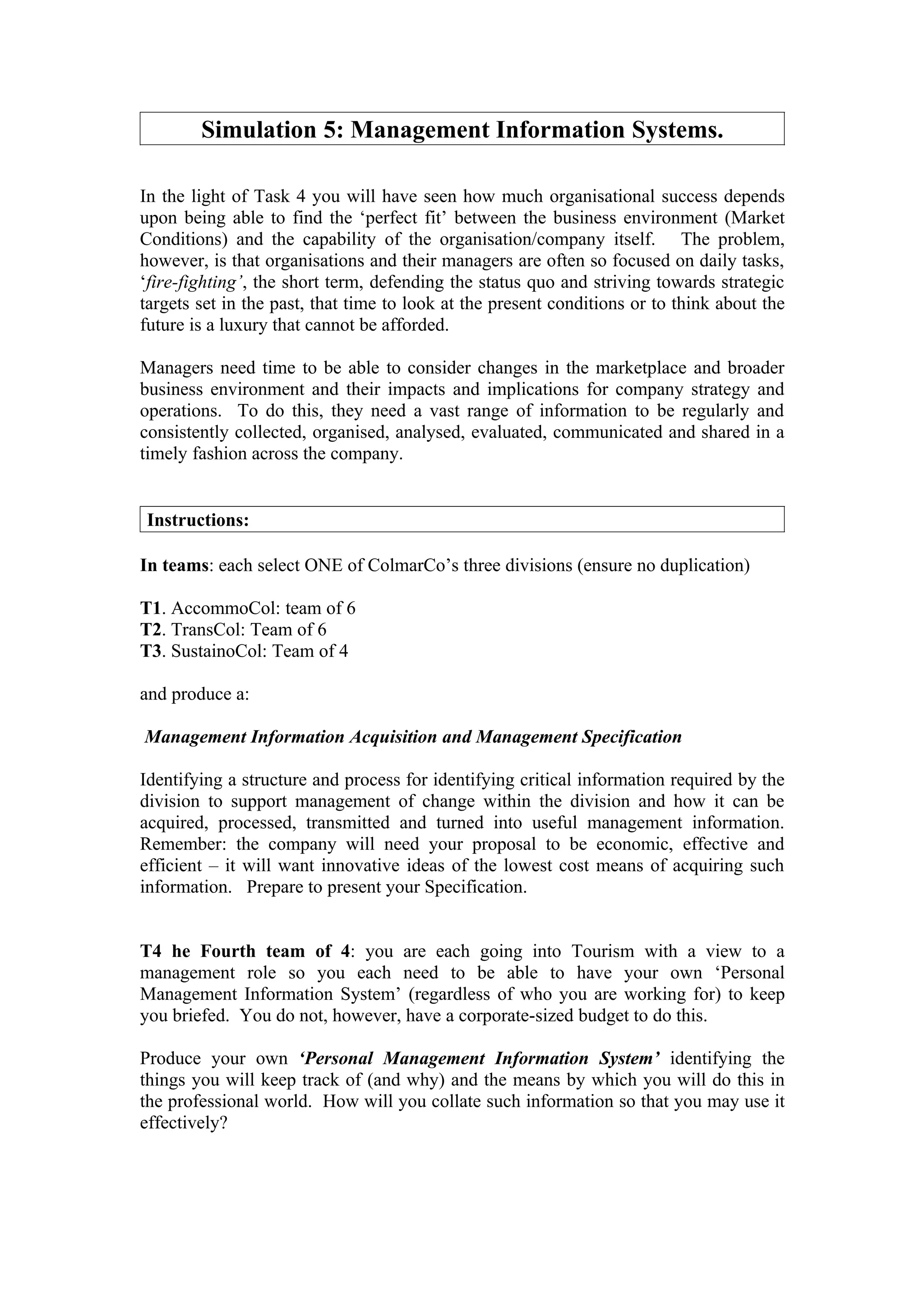 Students were divided into teams to develop management information systems proposals. Three teams were tasked with selecting a division and proposing a cost-effective structure and process for identifying, acquiring, processing, and disseminating critical information to support managing change within the division. A fourth team was tasked with developing their own personal management information systems to stay informed as future tourism managers with limited individual budgets.