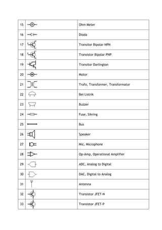 Dokumen ini berisi daftar simbol komponen elektronika beserta keterangan singkatnya. Setiap komponen, seperti resistor, transistor, dan kapasitor, diberikan nomor simbol untuk referensi. Ini adalah sumber informasi penting untuk pemahaman dasar tentang komponen dalam elektronik.