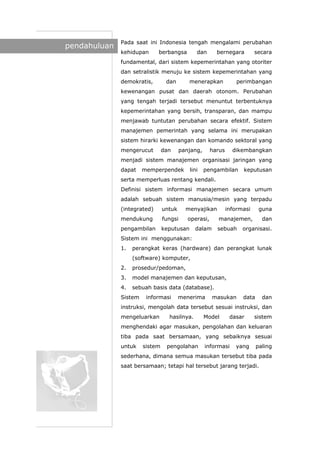 Dokumen ini adalah proposal untuk analisis, desain, dan implementasi sistem informasi manajemen daerah (SIMDA) yang mendukung pemerintahan daerah di Indonesia menuju kepemerintahan yang lebih transparan dan demokratis. Berbagai paket sistem informasi dirancang untuk mengelola administrasi pemerintah, layanan masyarakat, pengelolaan keuangan, dan aspek lainnya yang berkaitan dengan pengembangan daerah. Pengembangan sistem ini diharapkan dapat meningkatkan efisiensi layanan publik dan mendukung pengambilan keputusan yang lebih baik di tingkat daerah.