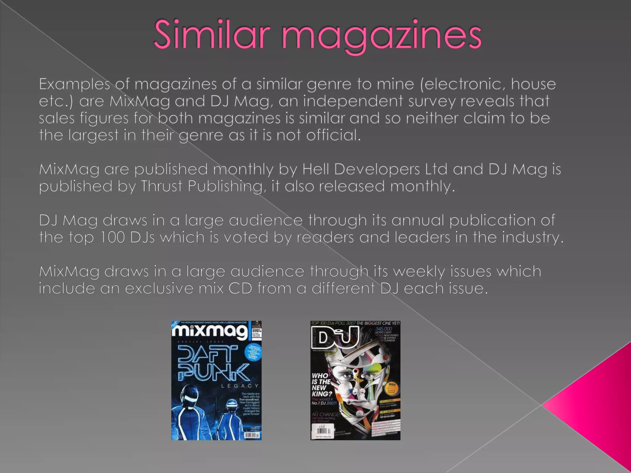 This document discusses several music magazines, including NME, Q, Kerrang!, Empire, MixMag, and DJ Mag. It provides details on their publication frequency, publisher, and historical circulation figures. MixMag saw its highest circulation of 70,000 copies per month in the 1990s during the peak of electronic music subcultures, but now circulates around 20,000 per issue. Similarly, DJ Mag peaked at around 40,000 copies monthly but now is also estimated to reach 20,000 per issue.