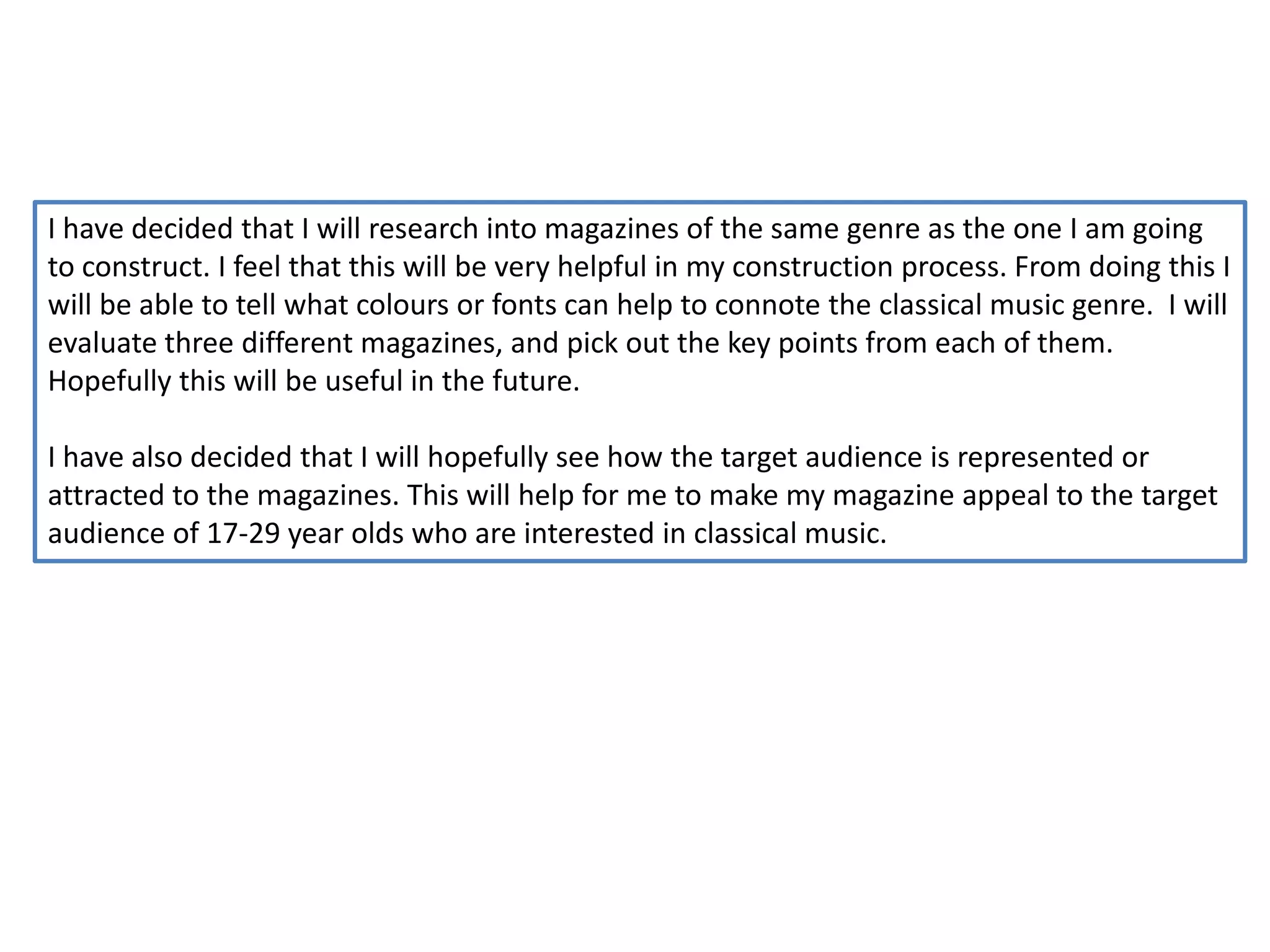 This document summarizes key aspects of three classical music magazines' covers that will help inform the construction of a new classical music magazine. The magazines use colors like red and prominent photos to attract their target audiences. They make claims in their mastheads about being the best or most popular classical music magazines. They also offer freebies like CDs or access to music channels. Evaluating design elements across magazines will help appeal to the target audience of 17-29 year olds interested in classical music.