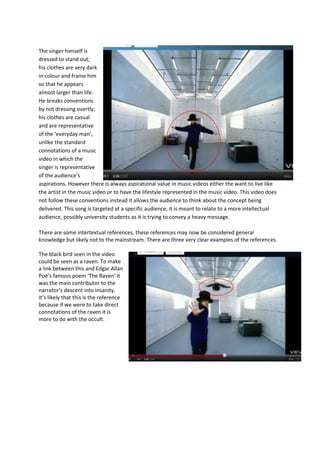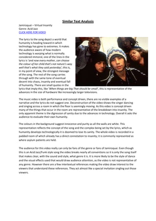 The music video for the song "Virtual Insanity" by Jamiroquai depicts the singer dancing in a room where the floor appears to move, representing a descent into insanity from advanced technology. There are references to works like Edgar Allan Poe's "The Raven" and the film "The Shining" that also involve madness. While breaking conventions of typical music videos, it uses visual illusions through camera angles and editing to enhance the concept of the song's lyrics. The video aims to provoke intellectual thought among audiences about humanity's relationship with technology.
