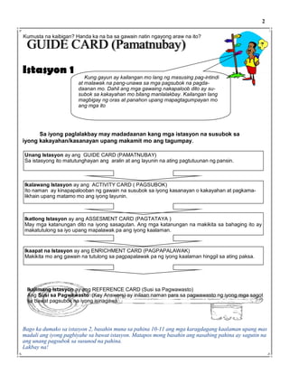 Ang dokumento ay isang kagamitang pampagkatuto para sa mga mag-aaral ng Baitang 10 na tumutukoy sa nobelang 'Ang Kuba ng Notre Dame' ni Victor Hugo. Naglalaman ito ng iba't ibang istasyon na naglalayong suriin ang kasanayan at kaalaman ng mga estudyante sa pamamagitan ng mga pagsubok at aktibidad. Ang mga istasyon ay may mga layunin at kinakailangang gawain na tumutulong sa pag-unawa at pagpapalawak ng kaalaman sa nasabing nobela.