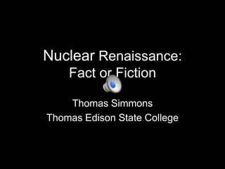 The document examines whether a nuclear renaissance is fact or fiction by analyzing potential drivers and constraints. It finds that while nuclear power provides clean energy and energy security, industrial bottlenecks, high costs, and politics make a large-scale renaissance unlikely. Climate change and energy security concerns may slightly favor nuclear power, but are not strong enough drivers to overcome constraints like industrial limitations and expensive upfront costs compared to alternatives. On balance, the analysis concludes a nuclear renaissance is improbable.