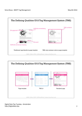 This document summarizes Simo Ahava's presentation on tag management systems (TMS). Some key points include: