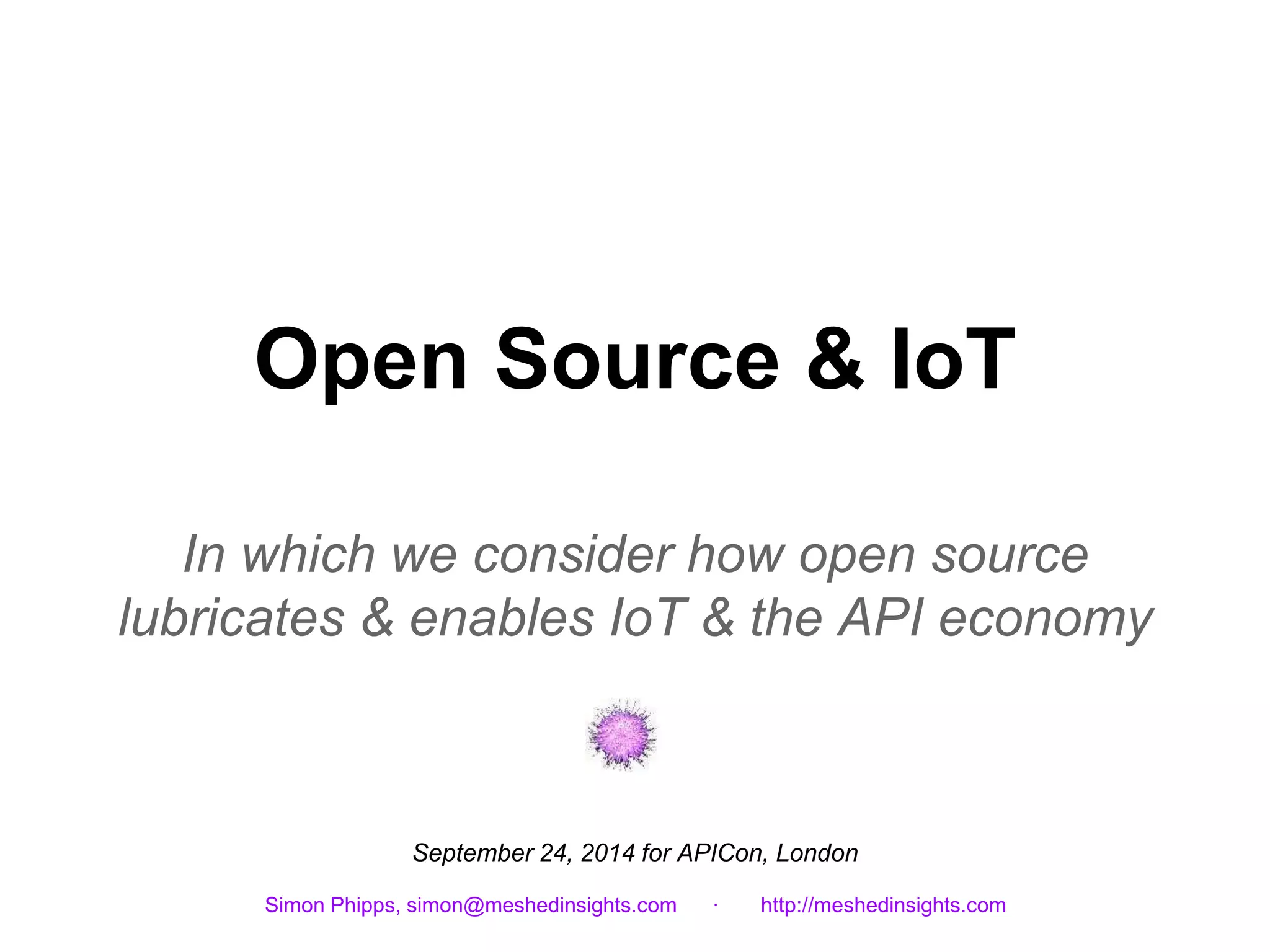 The document discusses the critical role of open source software in the IoT and API economy, emphasizing that permissionless models are essential for scalability in cloud computing. It outlines the key attributes of open source licenses, which facilitate community engagement and innovation, while also protecting users through modern patent defenses. Ultimately, the document argues that open source is vital for fostering flexible and confident participation in the API economy.