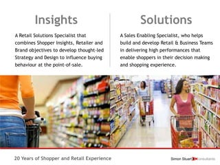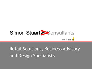 Simon Stuart Consultants is a retail consulting firm with 20 years of experience. As part of the international Havem Group, it provides strategic planning, store design, product management, and shopper marketing services to retailers. It focuses on localizing global best practices, improving retail performance through analytics and operational enhancements, and developing retail, shopper marketing, and design strategies. Some of its clients include top retailers, brands, FMCG companies, and others.
