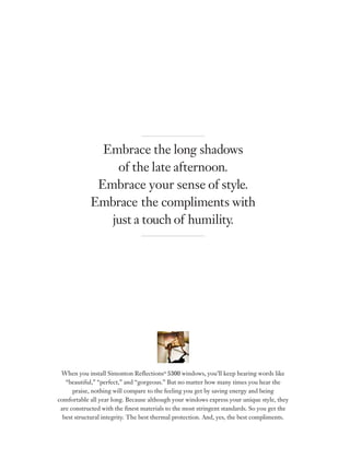 Simonton Reflections® 5300 windows combine aesthetic appeal with energy efficiency, featuring styles like double hung and sliders made from premium extruded vinyl for durability and maintenance-free living. The windows are designed to meet Energy Star criteria, offering advanced thermal protection that helps reduce heating and cooling costs. Backed by a comprehensive double-lifetime warranty, these windows are an investment in comfort and long-term value for homeowners.