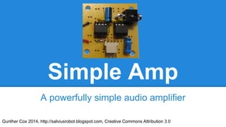 This document provides instructions for building a simple audio amplifier circuit using only a few basic components. The circuit uses two LM386 integrated circuits to provide amplification with a gain of 200. It can be built and tested on a breadboard before permanently assembling the circuit on a small printed circuit board. The assembled amplifier requires only a 9V battery, audio input, and speaker to operate and provides excellent sound quality with a minimal component design.