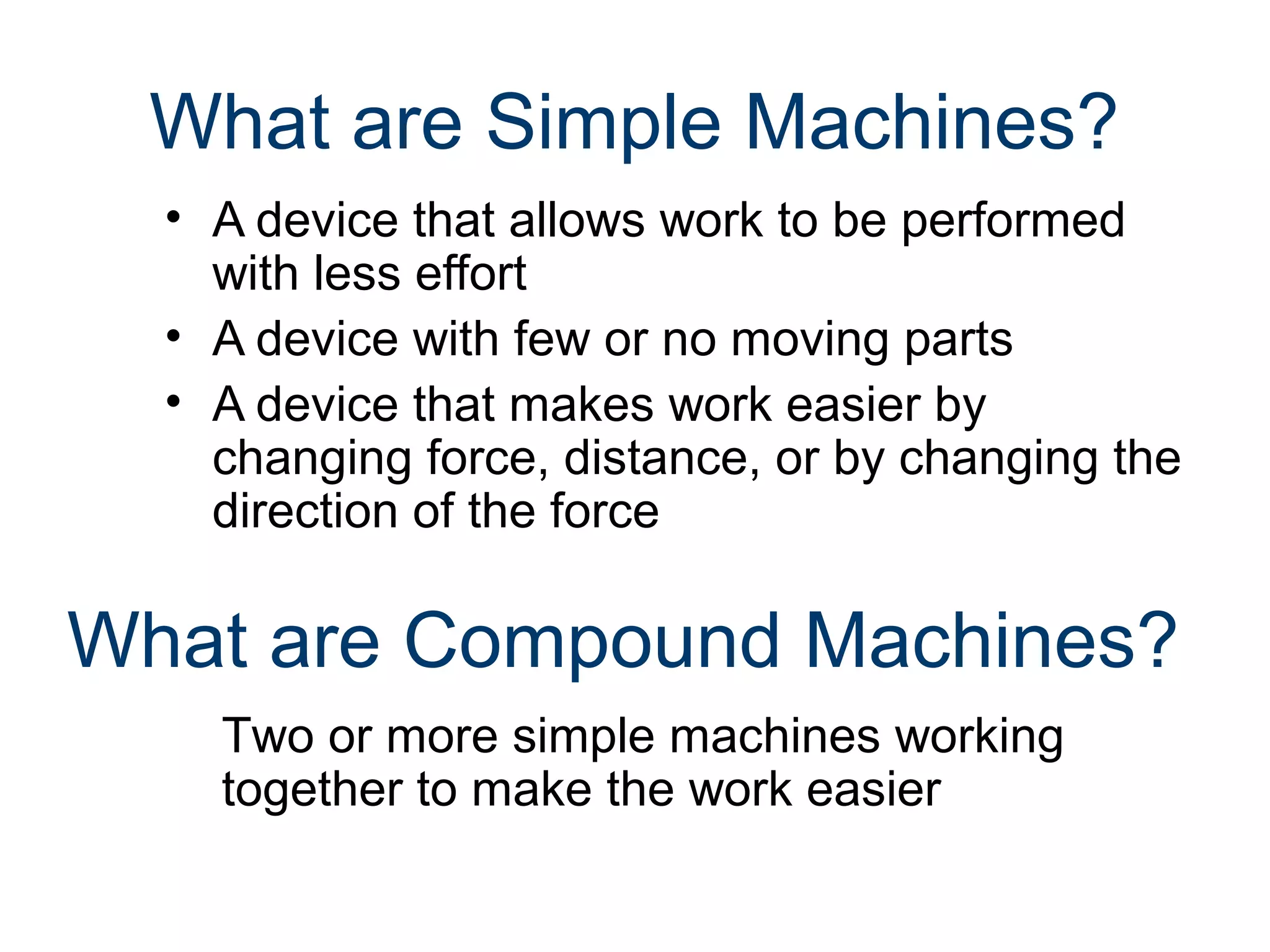 Simple machines make work easier by changing the amount of force needed or the distance through which force is applied. The six simple machines are the lever, wheel and axle, pulley, inclined plane, wedge, and screw. Compound machines combine two or more simple machines to make work even easier by providing a greater mechanical advantage.