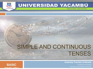 This document discusses simple and continuous tenses in English. It describes the basic forms of the simple present, past and future tenses. The simple present uses the base verb form or adds -s for third person singular. The simple past uses the base verb form or adds -ed, with many irregular verbs. The simple future uses the auxiliary verb "will" plus the base verb form. It also explains the present, past and future continuous tenses, which are used to describe ongoing or continuous actions in the present, past or future.