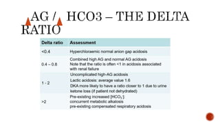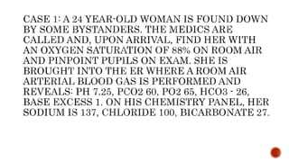 The document presents an overview of acid-base disorders, outlining key concepts such as acidosis, alkalosis, and their metabolic and respiratory types. It includes diagnostic considerations, compensation mechanisms, and clinical case examples illustrating various acid-base imbalances and their management. Treatment focuses on addressing underlying causes while considering both acute and chronic changes in acid-base status.
