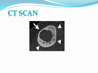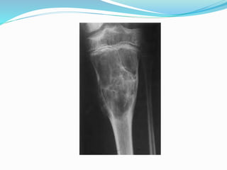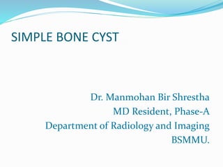 Simple bone cysts, also known as unicameral bone cysts, are benign bone lesions of unknown cause that typically occur in the metaphysis of long bones like the proximal humerus and femur in children and adolescents. They appear on x-ray as areas of translucency in the bone and often cause pain, swelling or pathological fractures. Treatment involves curettage and bone grafting if the risk of fracture is high or steroid injections if the cyst is small with a low fracture risk.
