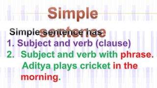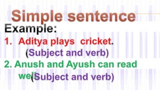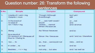 This document provides information about different types of clauses and sentences in English grammar. It defines independent clauses as main clauses that can stand alone as a complete sentence. Dependent clauses cannot stand alone and are part of a larger sentence. Complex sentences combine an independent clause with one or more dependent clauses using a subordinating conjunction. Compound sentences contain two independent clauses joined by a coordinating conjunction. The document gives numerous examples of simple, complex, and compound sentences and exercises to practice transforming between sentence types.