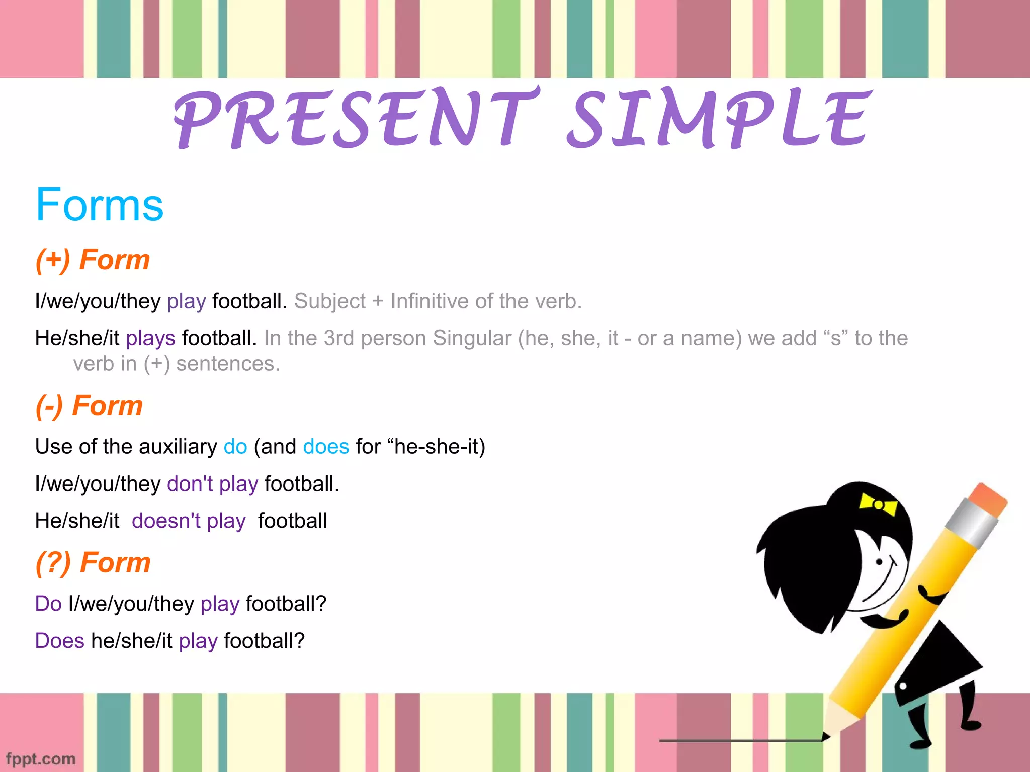 The document discusses the present simple and present continuous tenses in English. The present simple is used to talk about facts, habits, hobbies, and routines. It takes the form of subject + infinitive verb (or subject + 's' + infinitive verb for third person singular). The present continuous is used to talk about actions happening at the moment of speaking, fixed plans in the near future, and temporary actions. It takes the form of to be (am/is/are) + verb+ing. Examples are provided for the forms and uses of both tenses.