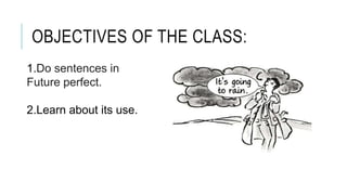 This document provides information about using the "be going to" construction to express future tense in English. It begins by listing the objectives of learning about this tense. It then explains that "be going to" uses the modal "be" conjugated according to the subject plus the base form of the main verb. It provides examples of affirmative, negative, and interrogative sentences. The document includes exercises for students to practice forming sentences in the future tense. It concludes by noting that "going to" is often reduced to "gonna" in informal speech.