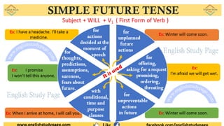 The document discusses the simple future tense in English. It provides examples of how to form positive, negative, and interrogative sentences in the simple future tense using "will" as the auxiliary verb. It also discusses the use of "shall" in certain cases with first person pronouns. Contractions of "will" are listed. Common uses of the simple future tense are outlined, including for predictions, spontaneous decisions, willingness/unwillingness, and promises. Questions are discussed and examples provided of forming questions starting with "wh-" words in the simple future tense.