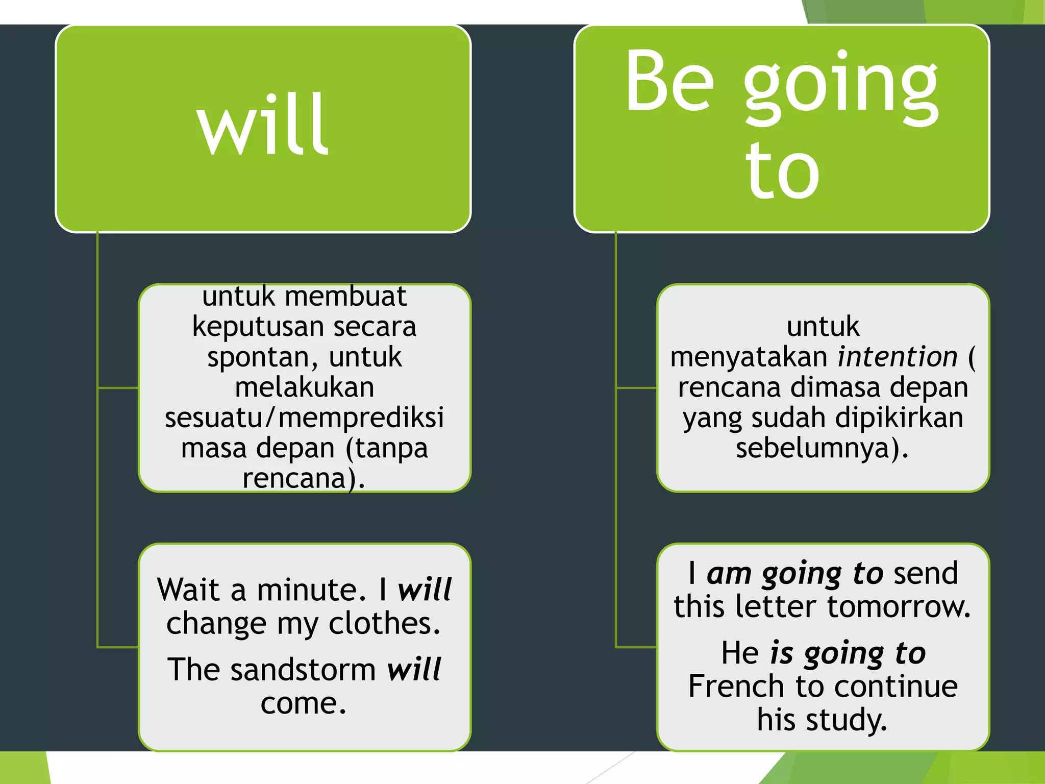 The document discusses the simple future tense and be going to future in English. It provides examples of how to form sentences using will for spontaneous or predicted future actions, and be going to for planned future intentions. Patterns given include subject + will + verb and subject + be + going + to + verb. Examples are provided such as "I will open the door" and "You are going to meet Jane tonight". Time expressions that can be used with simple future are also listed from tomorrow to three days later.