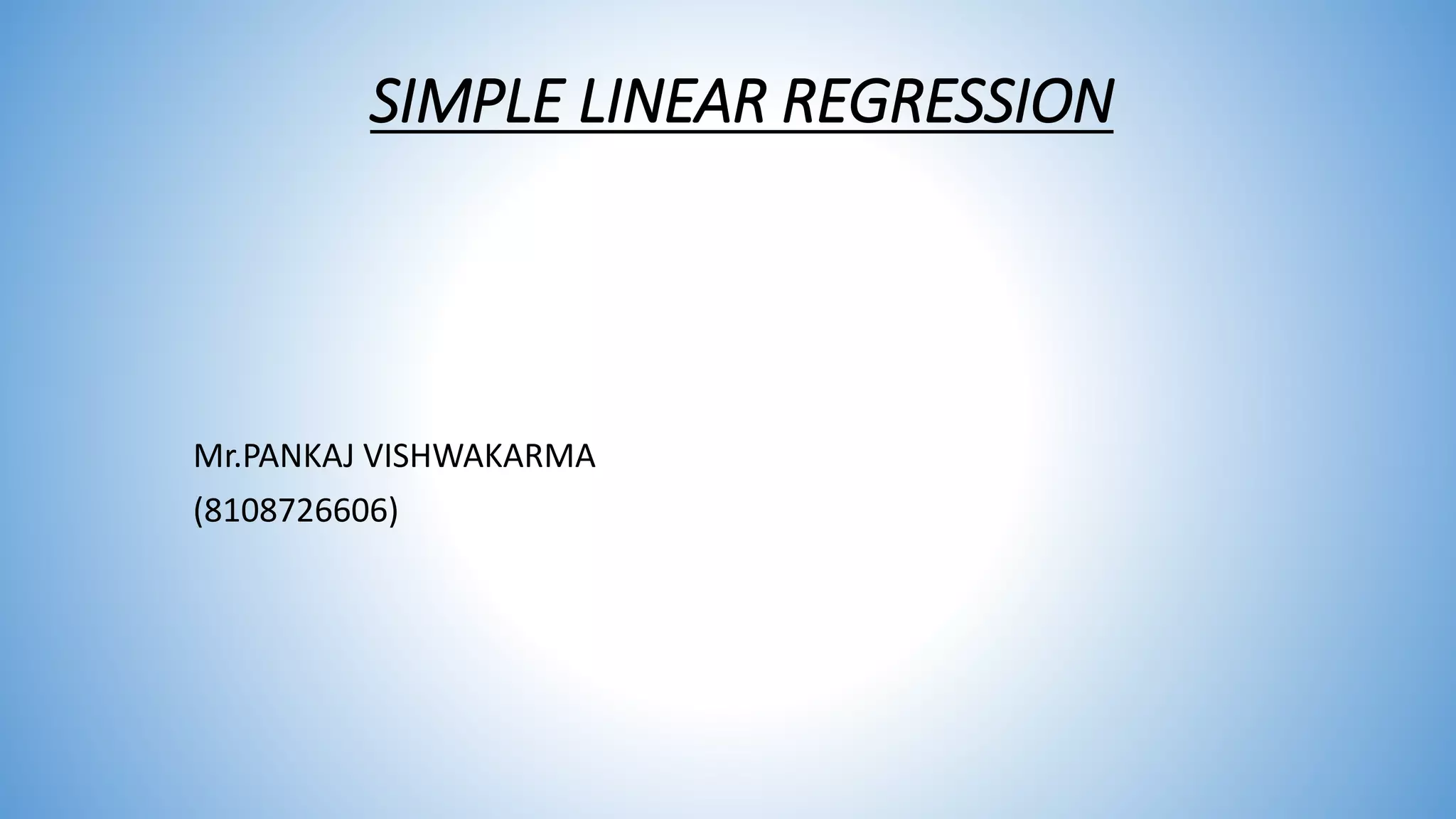 This document provides an overview of simple linear regression. It defines regression as determining the statistical relationship between variables where changes in one variable depend on changes in another. Regression analysis is used for prediction and exploring relationships between dependent and independent variables. The key aspects covered include: