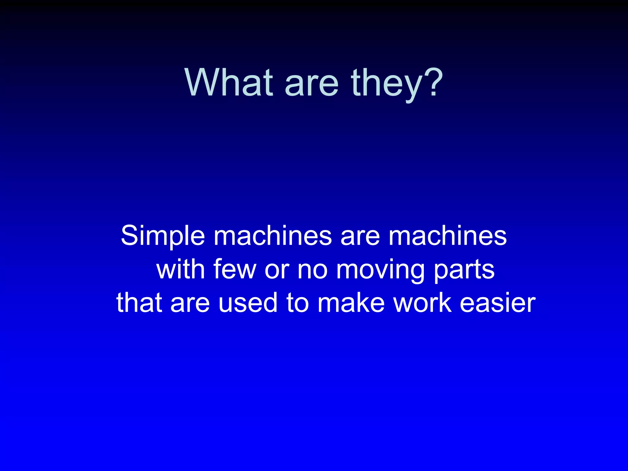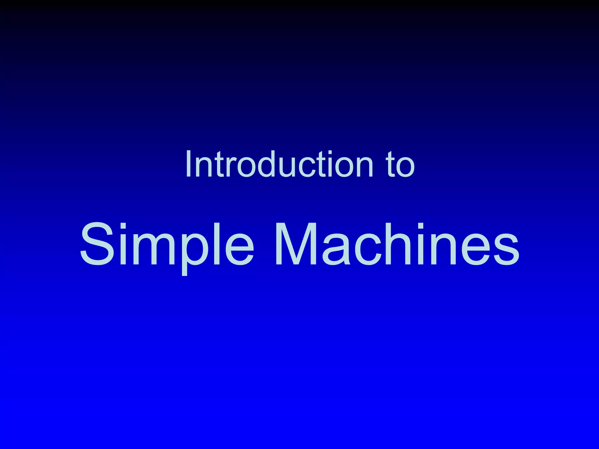 This document introduces the six types of simple machines: wedge, wheel and axle, lever, inclined plane, screw, and pulley. It describes how each machine works and provides everyday examples. Simple machines make work easier by reducing the amount of force needed to move or lift an object. Complex machines combine two or more simple machines to further increase mechanical advantage.