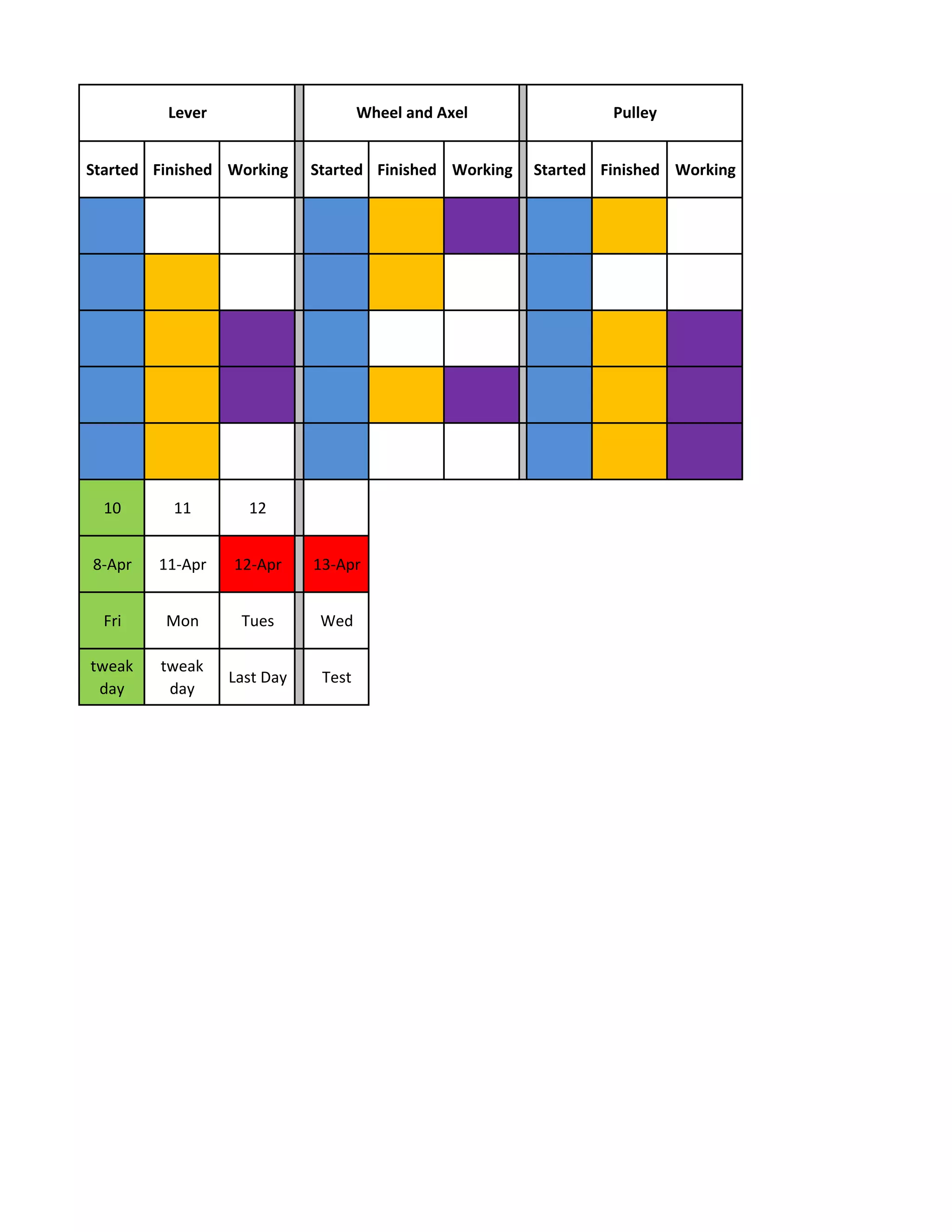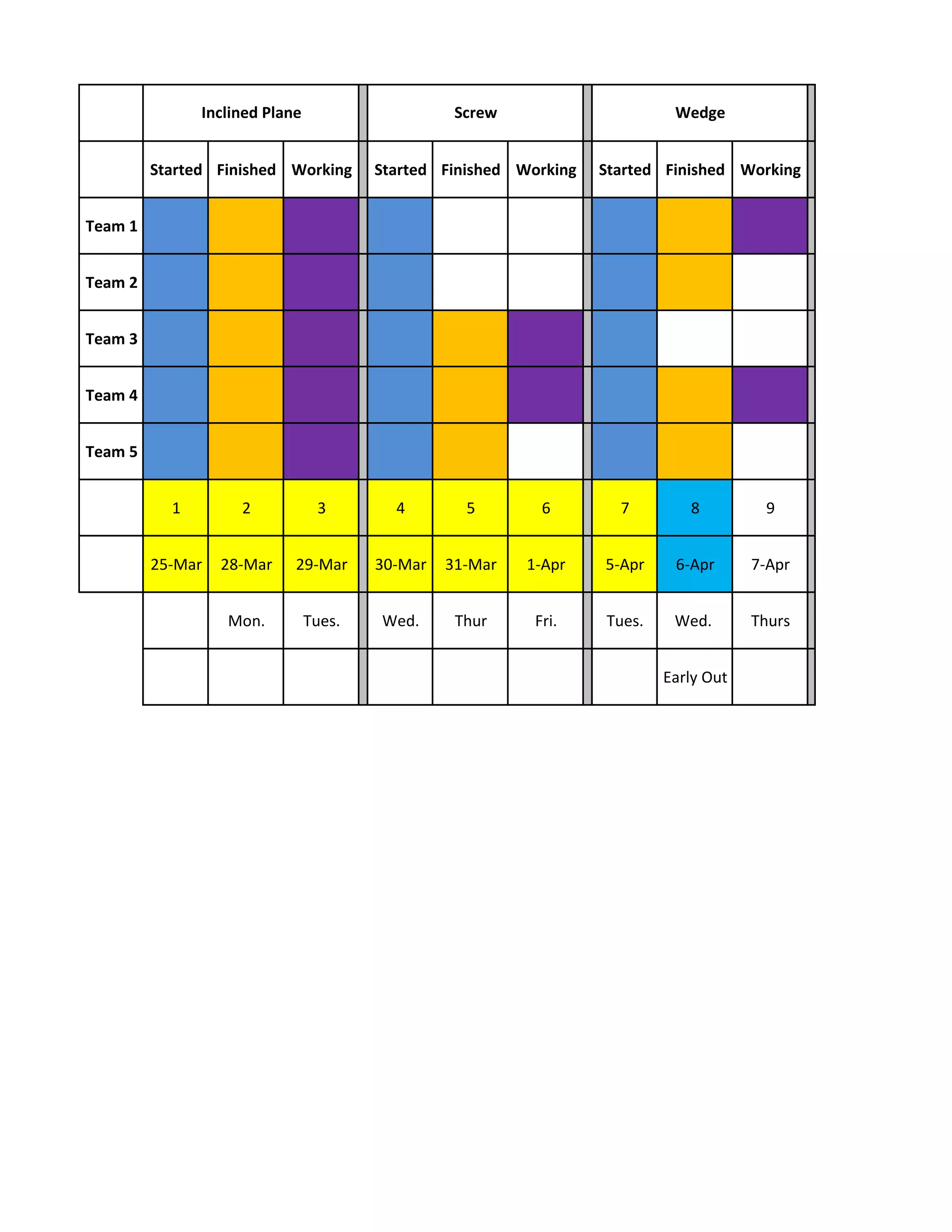 This document outlines the schedule for five teams to complete work on six simple machines - the inclined plane, screw, wedge, lever, wheel and axle, and pulley. It shows the start and end dates for each team to work on each machine, along with notes on early outs, tweak days, and tests.
