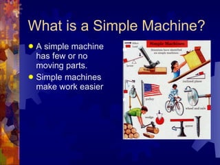 Simple machines include wheels and axles, pulleys, inclined planes, wedges, screws, and levers. They have few moving parts and make work easier by changing either the size or direction of the force applied. Wheels and axles allow rotation, pulleys use grooved wheels and ropes to apply force, and inclined planes lower the amount of force needed to lift an object. Levers come in three classes depending on the position of the fulcrum and load. Simple machines can be combined to create more complex machines.