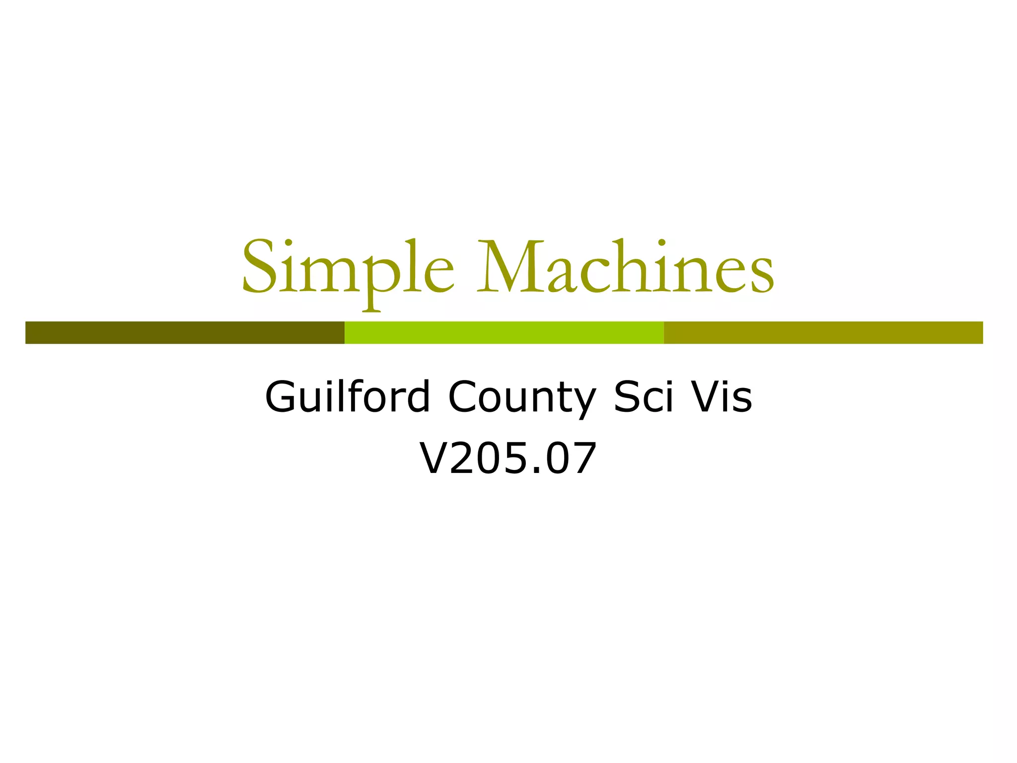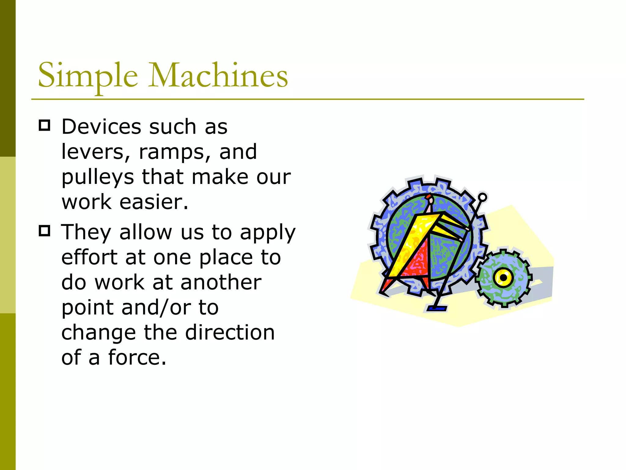 Simple machines are devices that make work easier by changing either the size or direction of a force. The six simple machines are the lever, pulley, wheel and axle, inclined plane, wedge, and screw. Each machine allows a smaller force to move a larger load over a greater distance by trading off either the amount of force or distance of movement. Levers are classified into three classes based on the relative positions of the load, effort, and fulcrum.