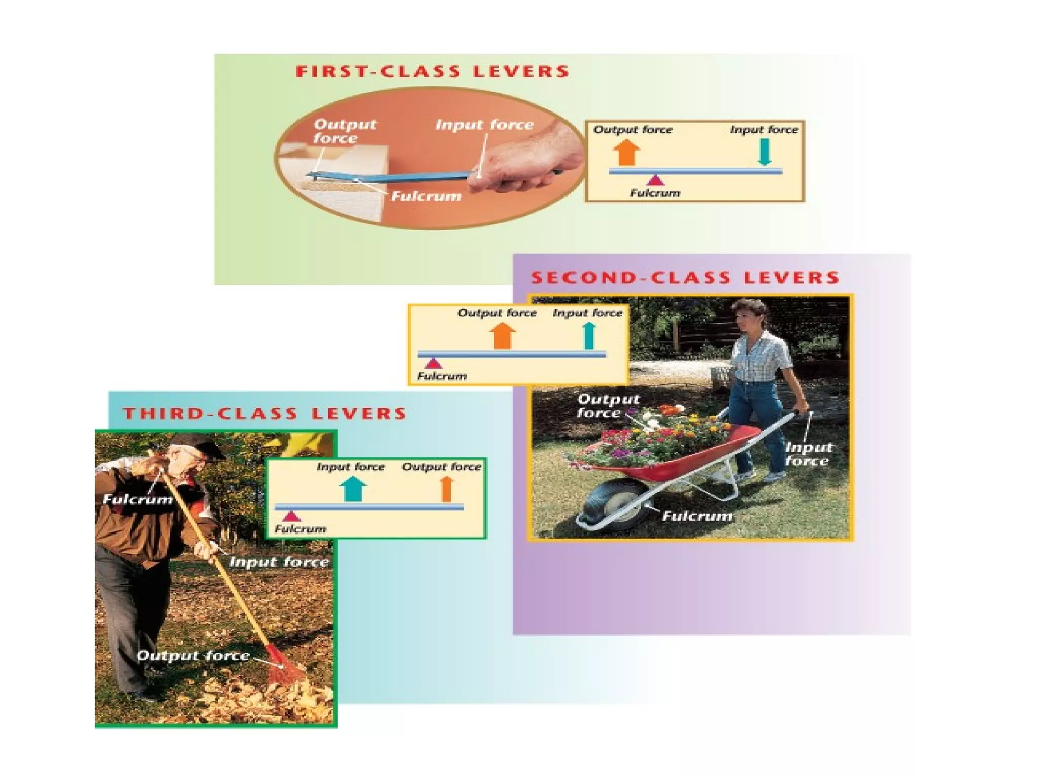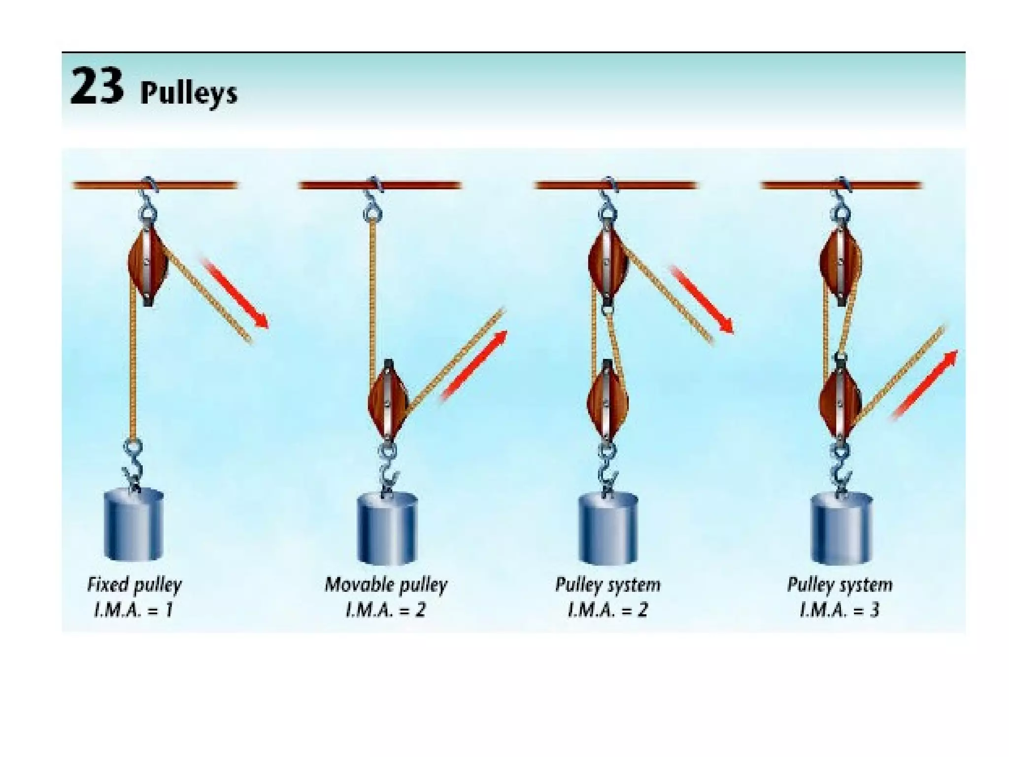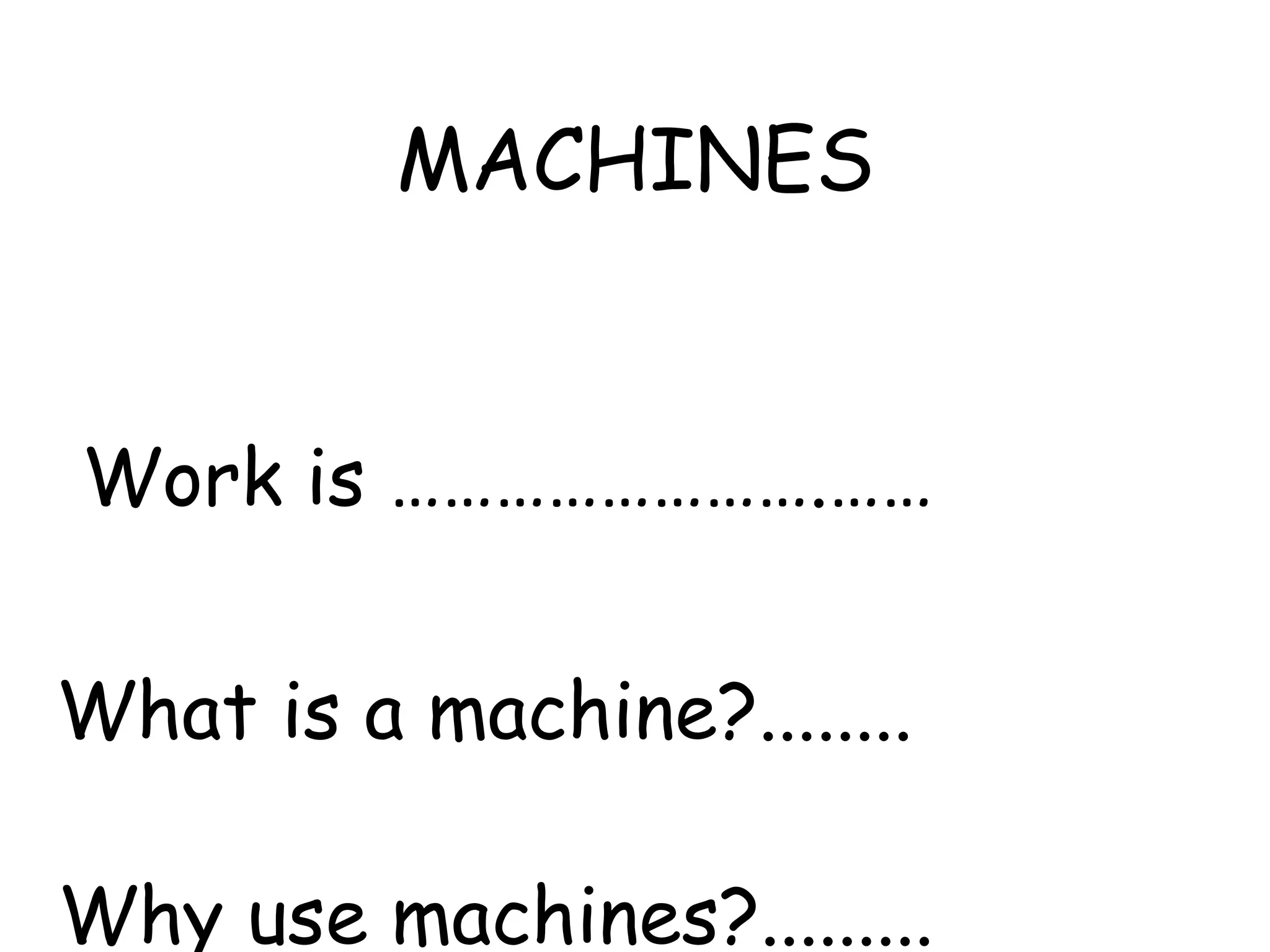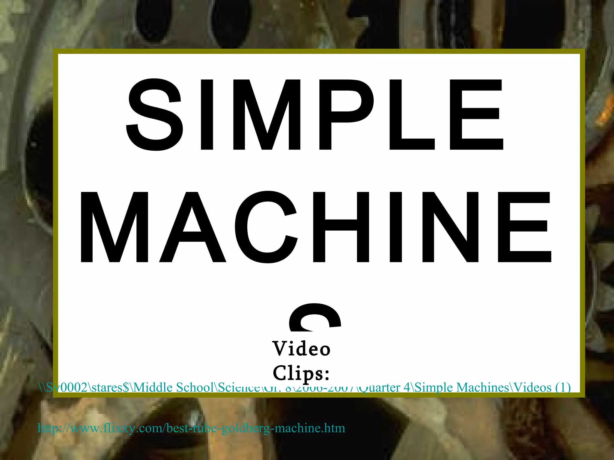 The document discusses different types of simple machines and how they work. It defines simple machines as devices that make work easier by changing either the amount of force needed, the distance over which force is applied, or the direction of the applied force. It then provides examples and descriptions of six simple machines: levers, inclined planes, pulleys, wedges, screws, and wheel and axle. For each machine it explains how it functions to reduce the amount of force required.