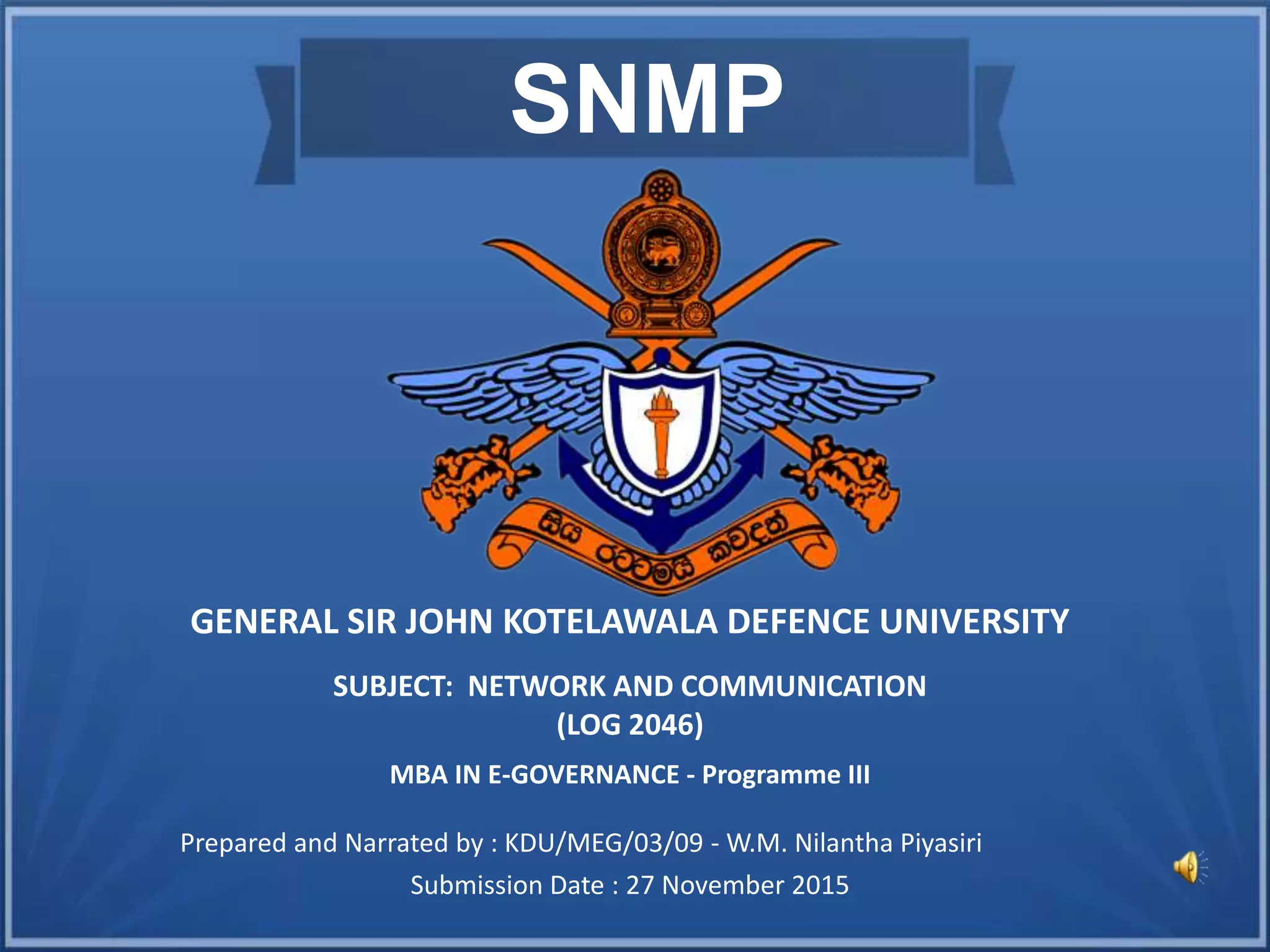 SNMP (Simple Network Management Protocol) is a standardized protocol used to monitor network devices and services. It comprises an agent on each device that collects data, and a manager that can read or write the agent's data. SNMP allows centralized monitoring of things like bandwidth usage, server resources, errors, and configuration. It is widely supported, extendable, portable, and lightweight. The three versions are V1 (basic), V2c (most common with enhancements), and V3 (adds security features). Key parts of SNMP include the protocol, SMI structure, and MIB management information base.
